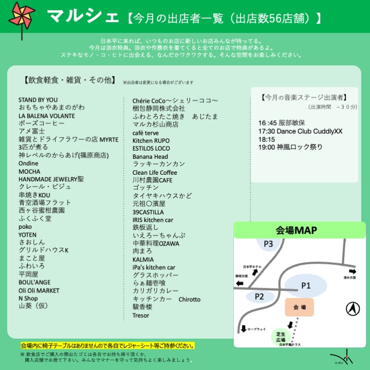 | *注意事項* *当イベントにはゴミ箱は設置しておりません。 廃棄物については各お買い上げ店舗にお戻しになるか、お持ち帰りのご協力をお願いいたします。 *駐車場は臨時駐車場を設けるなど確保はしておりますが、なるべく乗り合わせで来ていただけますと助かります。 駐車場情報はこちらです。 |